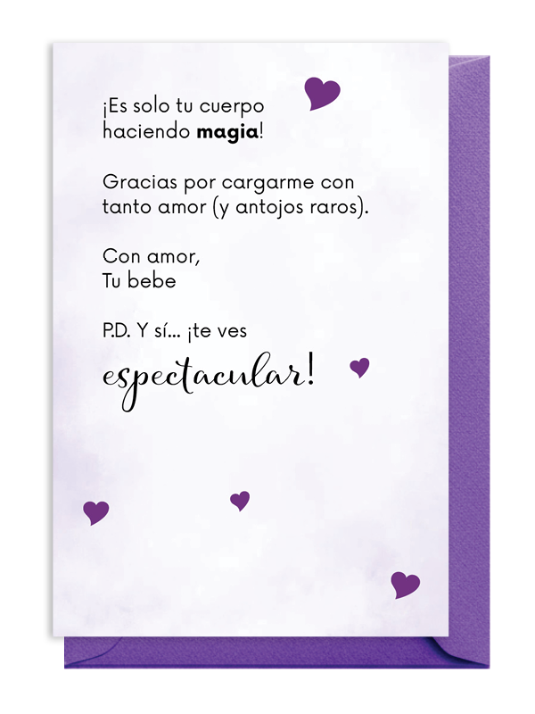 El bebé tiene un mensaje para Mamá: ¡No te preocupes por los cambios, es solo tu cuerpo haciendo magia! Esta encantadora tarjeta de embarazo es una tierna forma de agradecer a la futura mamá por llevar al bebé con tanto amor.